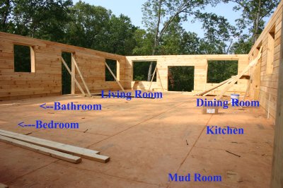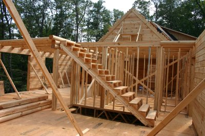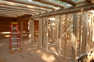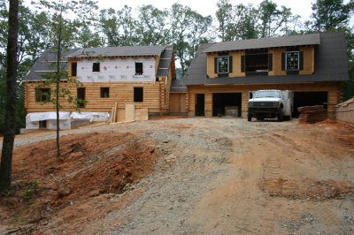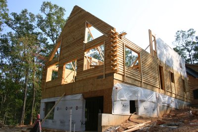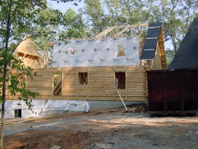Aug 9, 2007 - More logs were put on today. Framing done for some of the rooms in main house 1st floor. Started on stairs to 2nd floor. Electrician wired apartment. Plumbing added to garage apartment.