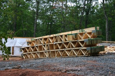 July 30, 2007 - The floor trusses for the main house were delivered today says they will start on them tomorrow.. Dave and I went to look at shingles.. opting for Rustic Evergreen. Now need to find someone to install them. Stairs from the garage to the apartment were done.